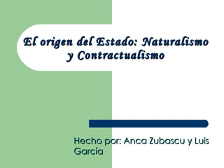 El documento contrasta las teorías naturalistas y contractualistas sobre el origen del Estado. Las teorías naturalistas ven al Estado como algo natural previo al individuo, mientras que las teorías contractualistas consideran que el individuo es anterior y que el Estado surge de un acuerdo entre individuos para garantizar sus derechos.