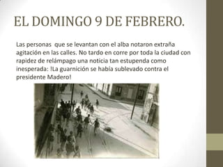 El documento resume los eventos de la Decena Trágica en México en febrero de 1913, cuando el general Victoriano Huerta traicionó al presidente Francisco I. Madero y se apoderó del gobierno mediante un golpe de estado. El documento describe día a día cómo Huerta se alió con el general Félix Díaz y se sublevó contra Madero en la Ciudadela de Mexico. A pesar de las advertencias sobre la deslealtad de Huerta, Madero continuó confiando en él, lo que llevó finalmente al arresto de Madero y