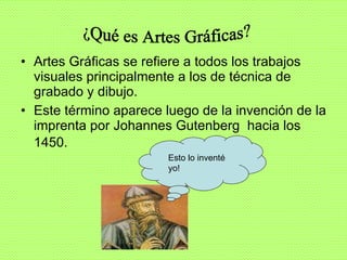 El documento habla sobre las artes gráficas, que se refiere a trabajos visuales de técnicas de grabado y dibujo. Describe la litografía, tipografía, grabado, dibujo y otras artes visuales. Explica que Johannes Gutenberg inventó la imprenta y Aloys Senefelder descubrió la litografía. Finalmente, menciona programas como Photoshop y Flash usados en diseño gráfico y HTML para construir páginas web.