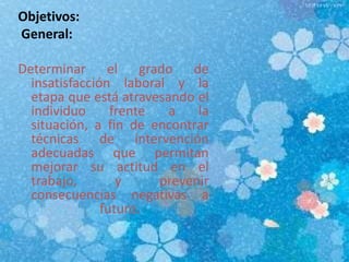 El documento presenta el objetivo de determinar el grado de insatisfacción laboral de un individuo y aplicar técnicas de intervención para mejorar su actitud en el trabajo. Describe los diagnósticos del individuo como insatisfacción, estrés y adicción al tabaco. Propone aplicar terapia sincrética utilizando técnicas como catarsis, escalas de satisfacción, silla vacía y relajación para ayudar al individuo a sobrellevar mejor su situación laboral.