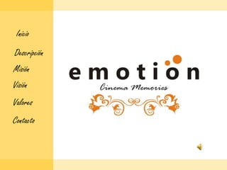 Este documento presenta la descripción, misión, visión y valores de una empresa de producción cinematográfica digital que graba eventos para guardar momentos memorables. La misión es generar emociones duraderas a través del tiempo mediante la captura de detalles en eventos como bodas y quinceañeras. La visión es convertirse en una empresa líder e innovadora en la industria con alta calidad de imagen y servicio al cliente.