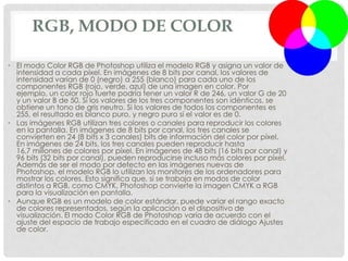 El documento describe diferentes modos de color en Photoshop, incluyendo RGB, CMYK y LAB. Explica que RGB utiliza tres canales de color y es el modo predeterminado, mientras que CMYK se usa para impresión y LAB se basa en la percepción humana del color. También cubre definiciones de logotipos, tipos de metamerismo y su relevancia en artes gráficas.