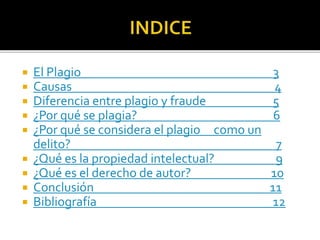 Este documento trata sobre el plagio, definiéndolo como presentar el trabajo de otra persona como propio. Explica que el plagio involucra robo de propiedad intelectual y fraude, y que generalmente ocurre por inseguridad, pereza o ignorancia. También cubre la diferencia entre plagio y fraude, la importancia de la propiedad intelectual y el derecho de autor, y concluye instando a evitar el plagio.