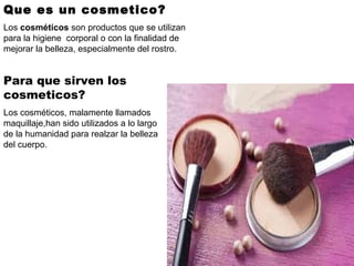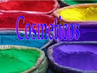 Los cosméticos se utilizan para la higiene corporal y mejorar la belleza. Están hechos de ingredientes como escamas de peces, mica y dióxido de titanio que proveen brillo y color. También pueden contener contaminantes orgánicos persistentes que representan riesgos para la salud si se absorben en el organismo. Los pigmentos son materiales que cambian el color de la luz que reflejan y se usan comúnmente en cosméticos, pinturas y textiles para proveer color.