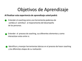 El documento presenta una introducción al coaching como una herramienta para mejorar el desempeño individual y de equipos. Explica que el objetivo es entender el proceso de coaching, sus elementos e interactuaciones, e identificar herramientas básicas en las diferentes etapas. También analiza por qué el coaching cobra más importancia hoy en día debido a la necesidad de empoderar a las personas con menos recursos.