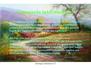 El documento habla sobre la importancia del comercio internacional para el desarrollo de las naciones. Explica que ninguna nación puede ser autosuficiente y necesita intercambiar recursos con otras a través de acuerdos. También describe los beneficios del financiamiento y la inversión extranjera directa para los países en desarrollo y cómo la globalización ha facilitado estos flujos de capital.