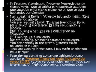 El documento explica el uso del presente continuo o presente progresivo en inglés. Se utiliza para acciones que están ocurriendo en el momento del habla y se forma con el verbo TO BE en presente simple como auxiliar y el verbo principal en gerundio con terminación -ING. Se proveen ejemplos como "I am speaking English" y ejercicios para practicar la formación y uso de este tiempo verbal.