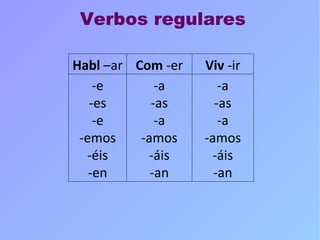 Este documento resume las reglas de conjugación para los verbos en presente de subjuntivo en español. Explica los cambios de las terminaciones para los verbos regulares y algunos verbos irregulares, así como cambios ortográficos comunes. Además, lista verbos que son irregulares en todas las personas del presente de subjuntivo.
