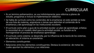 El documento presenta información sobre conceptos clave relacionados con la planeación educativa y el diseño curricular como currículo, plan de estudios y programas de estudio. Explica que el currículo se refiere a los contenidos de la enseñanza y puede considerarse como un plan o guía de actividades escolares. También cubre los elementos constitutivos de un currículo y sus diferentes dimensiones como el oficial, operacional y oculto. Por último, analiza los fundamentos de un currículo desde perspectivas legal, filosófica, sociológica, epistem