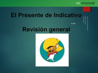 El documento proporciona una revisión general de la conjugación del presente de indicativo en español. Resume los verbos regulares agrupados por terminación (-ar, -er, -ir) y examina varios verbos irregulares, incluyendo aquellos que cambian su raíz en la primera persona singular y otros que son completamente irregulares como ser, ir y oír.