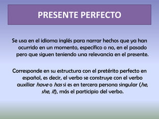 Este documento explica el uso del presente perfecto en inglés. Se usa para narrar hechos pasados que siguen teniendo relevancia en el presente. Se construye con el verbo auxiliar "have" o "has" en tercera persona singular más el participio pasado del verbo principal. El presente perfecto conecta el pasado con el presente y se usa con frecuencia con adverbios de tiempo como "for" o "since".