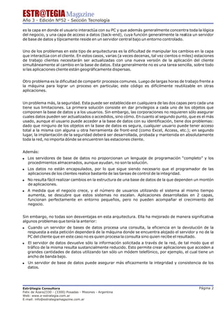 El documento describe la evolución de las arquitecturas de sistemas de información, desde los sistemas centralizados de una sola capa hasta las arquitecturas de tres capas más modernas. Explica que las arquitecturas de dos capas clientes-servidor ya no son adecuadas para las necesidades actuales, mientras que las arquitecturas de tres capas dividen la lógica en capas de acceso a datos, lógica de negocio y presentación, permitiendo mayor escalabilidad, reutilización de código y seguridad.