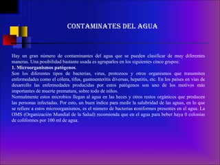 El documento describe cinco grupos principales de contaminantes del agua: 1) microorganismos patógenos, 2) desechos orgánicos, 3) sustancias químicas inorgánicas, 4) nutrientes vegetales inorgánicos como nitratos y fosfatos, y 5) sustancias radiactivas. También discute los impactos de la contaminación en las tierras, aguas, aire, aumento de la temperatura global, sedimentación, contaminación costera y derrames de petróleo.