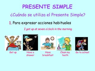 El documento explica el uso del presente simple en inglés. Se utiliza para acciones habituales, verdades universales y gustos. El verbo auxiliar "do/does" se usa en oraciones negativas e interrogativas. La forma afirmativa añade una "s" a los verbos de la tercera persona singular, excepto para verbos que terminan en consonante + "y" o en "-s", "-z", "-sh", "-ch", "-x", "-o".