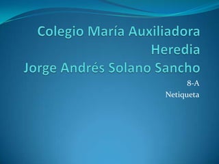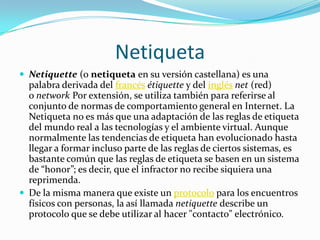 El documento habla sobre la netiqueta, que son las normas de comportamiento en Internet. Explica que la netiqueta se deriva de la palabra francesa "étiquette" y la palabra inglesa "net" y que son reglas similares a la etiqueta en el mundo real pero aplicadas al entorno virtual. También menciona que la netiqueta describe un protocolo para interactuar electrónicamente de la misma manera que existe un protocolo para encuentros físicos.