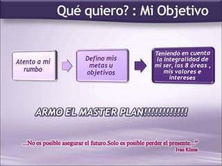 El documento habla sobre la importancia de planificar el desarrollo de la propia carrera de manera autodirigida para lograr satisfacción personal y expectativas de ganancias a lo largo del tiempo. Identifica ocho categorías básicas de desarrollo profesional y destaca la necesidad de contar con competencias portátiles y flexibilidad ante los cambios en el mercado laboral. Además, resalta que a menudo se requiere una doble acción de mejorar la situación actual mientras se trabaja en un plan a futuro.