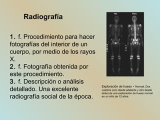 Este documento proporciona definiciones breves de varios términos tecnológicos comunes como radiografía, RAM, shareware, sistema operativo, software, spyware, URL, web, hosting web, Wi-Fi y WinZip. Explica conceptos como radiografía, RAM, sistemas operativos y tipos diferentes de software. También define términos relacionados con Internet como URL, web, hosting web y Wi-Fi.