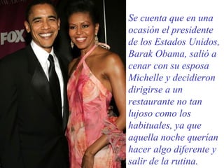 El presidente Obama y su esposa Michelle decidieron cenar en un restaurante menos lujoso para variar. El dueño del restaurante se acercó a saludar a Michelle porque estuvo enamorado de ella cuando era adolescente. Cuando el presidente bromeó que si se hubieran casado ella sería la dueña del restaurante, Michelle respondió que en realidad él sería el presidente de los Estados Unidos.