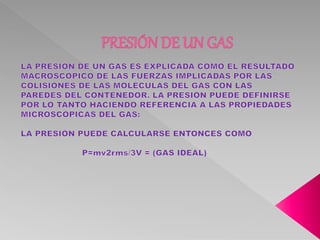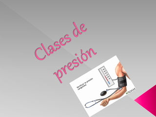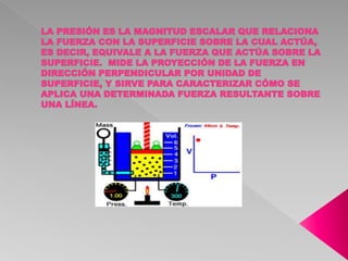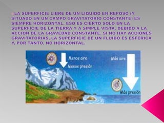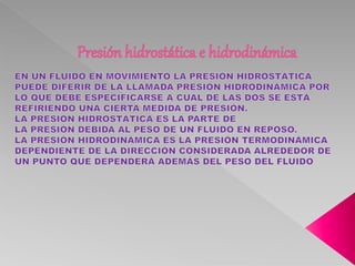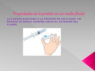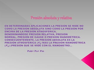 Este documento contiene información sobre varios temas relacionados con la presión. Explica que la presión en un fluido en reposo depende solo de la profundidad, y que puntos a la misma profundidad tendrán la misma presión. También describe cómo funcionan los sistemas de frenos antibloqueo en automóviles y cómo se basa la refrigeración en aplicar presión alternada a un fluido. Además, indica la presión a la que se inflan los neumáticos y define la presión capilar. Por último, proporciona de