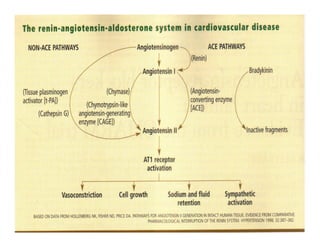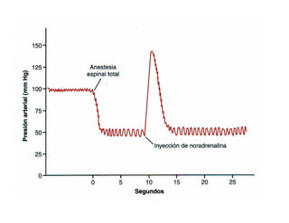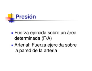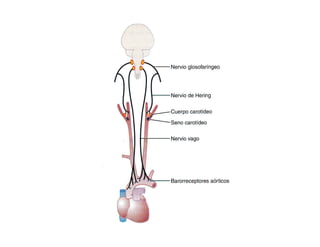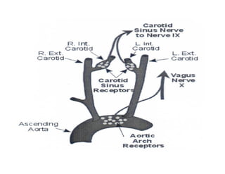 La presión arterial está regulada por mecanismos nerviosos y renales. Los barorreceptores de alta presión detectan aumentos de presión arterial y activan vías nerviosas que disminuyen la presión arterial mediante la relajación vascular y la disminución de la frecuencia cardíaca. El sistema renina-angiotensina-aldosterona también regula la presión arterial al aumentar la retención de sodio y agua cuando la presión arterial disminuye. El péptido natriurético atrial contrarresta los efectos del sistema renina-ang