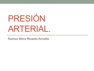 La presión arterial se define como la fuerza ejercida por la sangre contra las paredes de los vasos sanguíneos. Se mide en milímetros de mercurio (mmHg) y depende del gasto cardiaco y la resistencia vascular. La presión sistólica es la máxima presión durante el ciclo cardiaco, mientras que la presión diastólica es la mínima. El documento también describe los factores que afectan la presión arterial como la viscosidad de la sangre, el diámetro vascular y el control nervioso y renal.