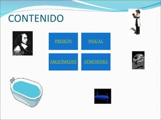 El documento resume los principios básicos de la hidrostática. Explica que la hidrostática estudia los fluidos en estado de equilibrio y se basa en los principios de Pascal y Arquímedes. Define la presión como la fuerza ejercida sobre una superficie y explica cómo depende de la profundidad en un fluido según el principio fundamental de la estática de fluidos.