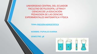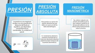 Este documento trata sobre la presión hidrostática. Define la presión hidrostática como la presión generada en el interior de toda masa o material en estado líquido provocada por el peso del líquido en un cuerpo sumergido. Explica que la presión hidrostática de un fluido depende de la densidad y la altura del fluido con referencia al punto donde se mide. También menciona que la presión ejercida sobre un fluido poco compresible se transmite con igual intensidad en todas las direcciones dentro de un recipiente, de acuerdo con el principio de
