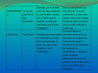 Este documento resume las opiniones filosóficas de varios presocráticos sobre el origen y la naturaleza del universo. Tales de Mileto opinaba que el agua era el principio de todo, mientras que Anaxímenes creía que era el aire o la niebla. Anaximandro pensaba que el mundo surgió de algo indefinido. Heráclito creía que todo estaba en constante cambio y movimiento. Parmenides sostenía que nada podía surgir de la nada. Anaxágoras opinaba que todo estaba compuesto de partículas invis