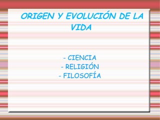 Este documento explora las perspectivas científicas, religiosas y filosóficas sobre el origen y evolución de la vida. Desde el punto de vista científico, se discuten teorías como el Big Bang, Big Rip y Big Crunch. Las religiones judeocristiana y griega ofrecen explicaciones basadas en la creación divina o narrativas míticas. Los primeros filósofos presocráticos como Tales, Pitágoras y Demócrito buscaron principios como el agua, los números o los átomos para explicar el origen
