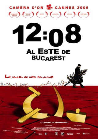 El documento presenta la película "12:08 Al Este de Bucarest" del director rumano Corneliu Porumboiu. La película se centra en tres personas en una pequeña ciudad rumana que recuerdan los eventos de la revolución rumana de 1989 dieciséis años después mientras son entrevistados en un programa de televisión local. A través de sus recuerdos contradictorios y pretenciones de heroísmo, la película examina cómo la revolución ha sido transformada en la memoria colectiva con el paso del tiempo.