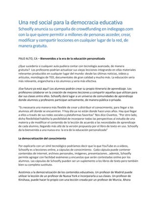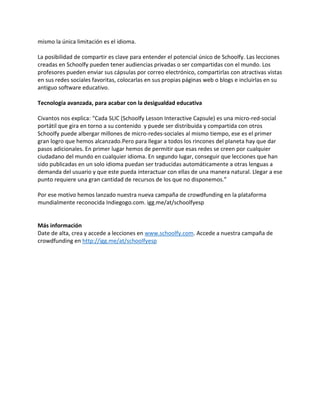 Schoolfy anuncia una campaña de crowdfunding para permitir que cualquier persona pueda acceder, crear y compartir lecciones educativas de forma gratuita a través de su plataforma en línea. La plataforma Schoolfy pretende democratizar el conocimiento educativo al permitir que profesores de cualquier parte del mundo compartan y utilicen lecciones creadas por otros, y dar acceso a una educación personalizada y relevante para los estudiantes.