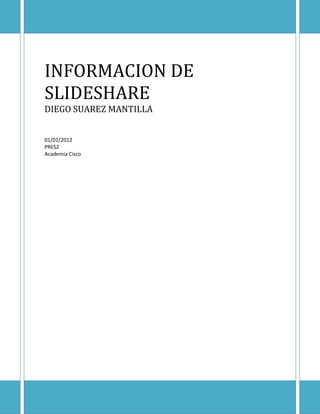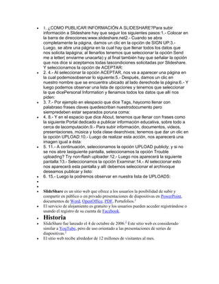 Este documento proporciona instrucciones en 15 pasos para publicar información en SlideShare. Explica cómo crear una cuenta, completar el perfil personal, etiquetar y describir los documentos, y cargar archivos de presentaciones, documentos y videos de manera pública o privada. También brinda breve información histórica sobre SlideShare, como que fue lanzado en 2006 y ofrece alojamiento gratuito para compartir presentaciones de diapositivas de manera similar a YouTube.
