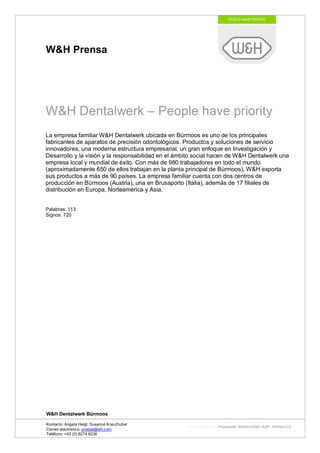 W&H es una empresa familiar austriaca fundada en 1890 que fabrica instrumentos y aparatos odontológicos. Con aproximadamente 980 empleados en todo el mundo, W&H exporta sus productos innovadores a más de 90 países. La empresa ha crecido para incluir tres plantas de producción a través de inversiones en I+D, expansión de instalaciones y una red de distribución global.
