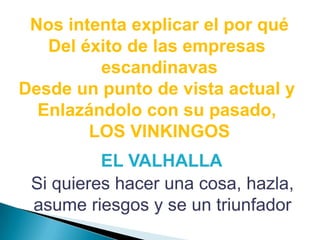 Este documento resume un libro sobre el éxito de las empresas escandinavas y cómo se inspiran en los valores vikingos. Explica que estas empresas se arriesgan con nuevas ideas sin estudios de mercado detallados, confiando en la calidad de sus productos. También enfatiza la importancia de la sociedad democrática y de los derechos laborales en Escandinavia, así como de crear un buen ambiente laboral donde los empleados aportan ideas. El marketing vikingo se basa más en contar buenas historias que en grandes campañas publicitarias