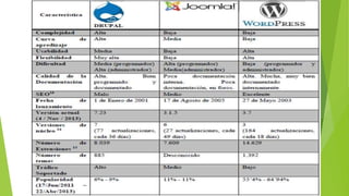 Este documento proporciona información sobre gestores de contenido como PrestaShop, WordPress, Joomla y Drupal. Explica las características y procesos de instalación de PrestaShop, así como las diferencias entre los principales gestores de contenido. También discute los tipos de hosting y factores a considerar al seleccionar una solución de gestión de contenido.