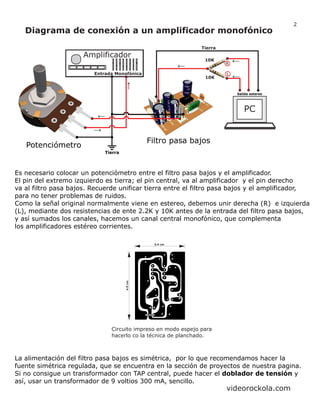 Este documento describe un filtro pasa bajos que permite pasar frecuencias bajas pero atenua las altas. Utiliza un condensador de 0.22 microfaradios para presentar baja impedancia a las frecuencias altas y desviarlas, mientras que las frecuencias bajas pasan a la salida del amplificador. También explica cómo imprimir el circuito, conectarlo a un amplificador monoaural y proveerle una fuente de alimentación simétrica.