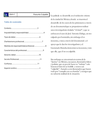 El documento presenta un análisis ético del caso de José Antonio Zúñiga, un hombre acusado injustamente de homicidio en la película "Presunto Culpable". Analiza conceptos como la imputabilidad, responsabilidad y deberes de varios profesionales involucrados en el caso. Resalta la falta de ética profesional de jueces, abogados y policías que buscaban culpar a un hombre inocente, en contraste con los investigadores que lo apoyaron para demostrar su inocencia. Finalmente, reflexiona sobre la necesidad de que las univers