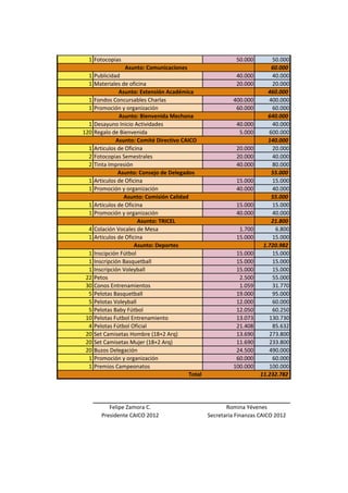 Este documento presenta el presupuesto del Centro de Alumnos de Ingeniería Civil (CAICO) para el año 2012, detallando los gastos por concepto en diferentes áreas como biblioteca, extensión cultural, acción social, deportes, comunicaciones, entre otros, ascendiendo el presupuesto total a $11.232.782.