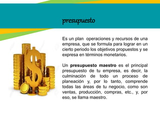 El documento habla sobre los tipos de presupuestos. Explica que un presupuesto es un plan financiero que detalla los ingresos y gastos proyectados de una empresa. Luego describe varias clasificaciones de presupuestos, incluyendo presupuestos públicos vs privados, corto plazo vs largo plazo, flexibles vs fijos. Finalmente, resume las distintas fases del proceso presupuestario como previsión, planeación, formulación, aprobación, ejecución y control.
