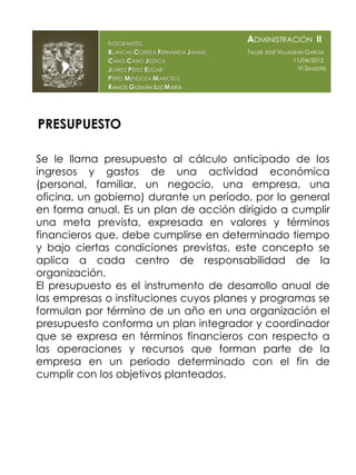 El documento presenta información sobre el presupuesto, incluyendo su definición como el cálculo anticipado de los ingresos y gastos de una actividad económica durante un período determinado, generalmente anual. Explica que el presupuesto es un plan financiero que expresa los objetivos de una organización y coordina las diferentes áreas. Además, clasifica los presupuestos según su flexibilidad, el período que cubren y el campo de aplicación dentro de una empresa.