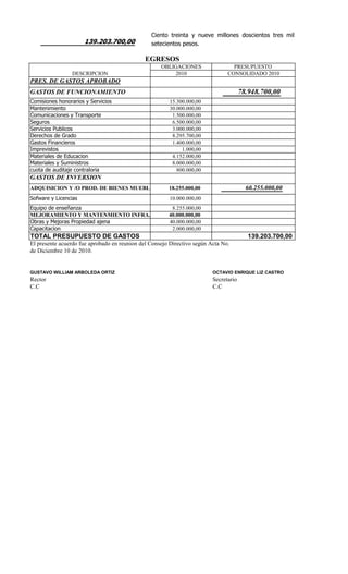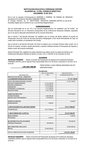 Este documento aprueba el presupuesto de ingresos y egresos del Fondo de Servicios Educativos de la Institución Educativa Cárdenas Centro para el año 2011. El presupuesto total es de 139.203.700 pesos. Los ingresos provendrán principalmente de la venta de servicios educativos, arriendos y transferencias. Los egresos se destinarán a gastos de funcionamiento como mantenimiento, comunicaciones y materiales educativos, así como a inversión en bienes muebles, mejoramiento de infraestructura y capacitación