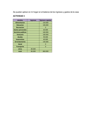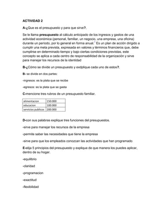 El documento define el presupuesto como un cálculo anticipado de los ingresos y gastos de una actividad económica durante un período, generalmente anual. Explica que un presupuesto se divide en ingresos, que es el dinero recibido, y egresos, que es el dinero gastado. Menciona algunos rubros comunes de un presupuesto familiar como alimentación, educación y servicios públicos. Además, describe funciones del presupuesto como manejar los recursos de una empresa, conocer sus necesidades y planificar actividades.