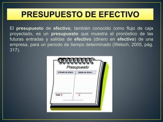 El presupuesto de efectivo es un pronóstico de las entradas y salidas de efectivo de una empresa en un periodo determinado. Muestra si habrá excedentes o déficit de efectivo y permite identificar necesidades de financiamiento. Un presupuesto de efectivo es útil para la administración financiera de una empresa ya que ayuda a prever pagos y cobros con anticipación y restringe gastos para evitar deudas.