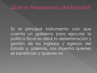 El presupuesto del estado es el principal instrumento que usa el gobierno para ejecutar la política fiscal y mostrar cómo se gastan y en qué se gastan los recursos del estado. La política fiscal determina cuánto se gastará y en qué, y revela si el gobierno prioriza las necesidades del país y la población o los intereses de grupos económicos. El presupuesto sigue un ciclo anual y comprende los ingresos, gastos y equilibrio del sector público.