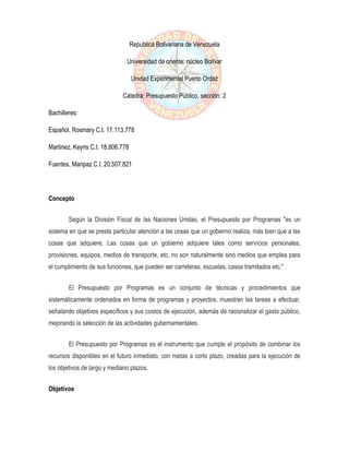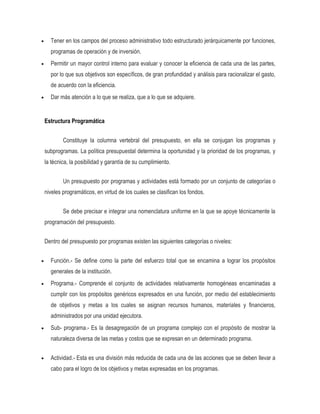 El documento explica el presupuesto por programas, el cual se enfoca en lo que un gobierno realiza en lugar de lo que adquiere. Describe la estructura programática del presupuesto por programas, incluyendo funciones, programas, subprogramas y actividades. También explica el ciclo programático, el cual incluye la programación, ejecución, y evaluación del presupuesto a través del tiempo. Finalmente, detalla cómo clasificar el presupuesto por programas según el objeto del gasto, lo administrativo, y lo funcional.