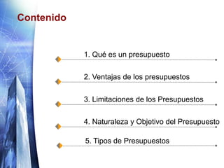Este documento describe la naturaleza y objetivos de los presupuestos. Explica que un presupuesto es un plan financiero integral para un período determinado que ayuda a una empresa a lograr sus objetivos. También enumera las ventajas de los presupuestos, como motivar a la alta gerencia, mejorar la eficiencia y facilitar el control. Además, reconoce algunas limitaciones como que se basan en estimaciones y requieren adaptación constante. Finalmente, identifica varios tipos de presupuestos como estáticos, flexibles e incrementales.