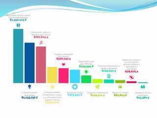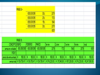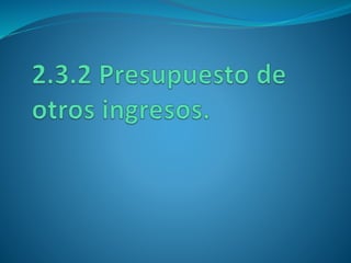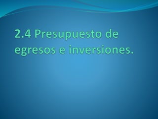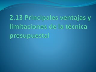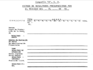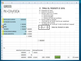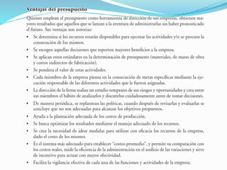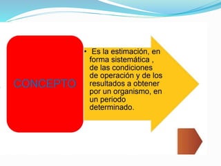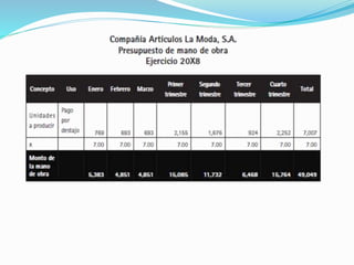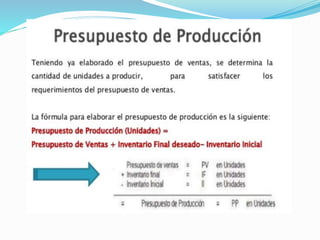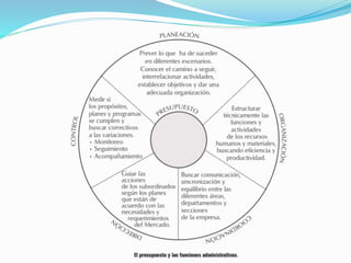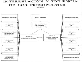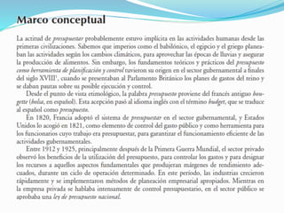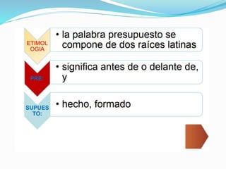 El documento presenta información sobre presupuestos, incluyendo su etimología, concepto, objetivos y clasificaciones. Explica que un presupuesto es un conjunto de pronósticos para un periodo determinado y analiza los orígenes y evolución del presupuesto desde las civilizaciones antiguas hasta su uso moderno. También describe los requisitos para un buen presupuesto como el conocimiento de la empresa, la exposición del plan, la coordinación y el periodo presupuestal.