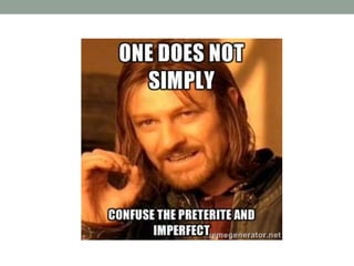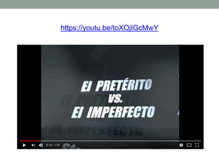 Este documento explica la diferencia entre el pretérito e imperfecto en español. El pretérito se usa para acciones completadas o eventos específicos en el pasado, mientras que el imperfecto se usa para acciones de fondo, situaciones repetidas o continuadas, y descripciones de tiempo, lugar y emoción. Incluye ejemplos de conjugaciones de verbos regulares en ambos tiempos y ejercicios de práctica para identificar cuándo usar cada uno.