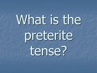 El documento explica el tiempo pretérito en español. El pretérito se usa para acciones completadas en el pasado. Se forma de manera regular para verbos -AR, -ER e -IR, pero algunos verbos como ser, ir, dar y ver son irregulares. También hay cambios en la forma "yo" para verbos que terminan en -car, -gar y -zar. Los verbos -ir que cambian la raíz en presente también cambian en pretérito, pero solo en las formas "él/ellos".