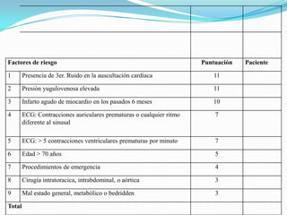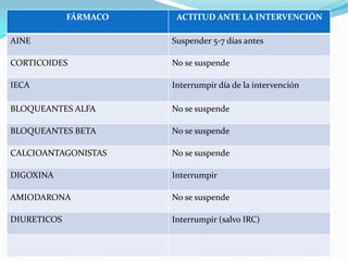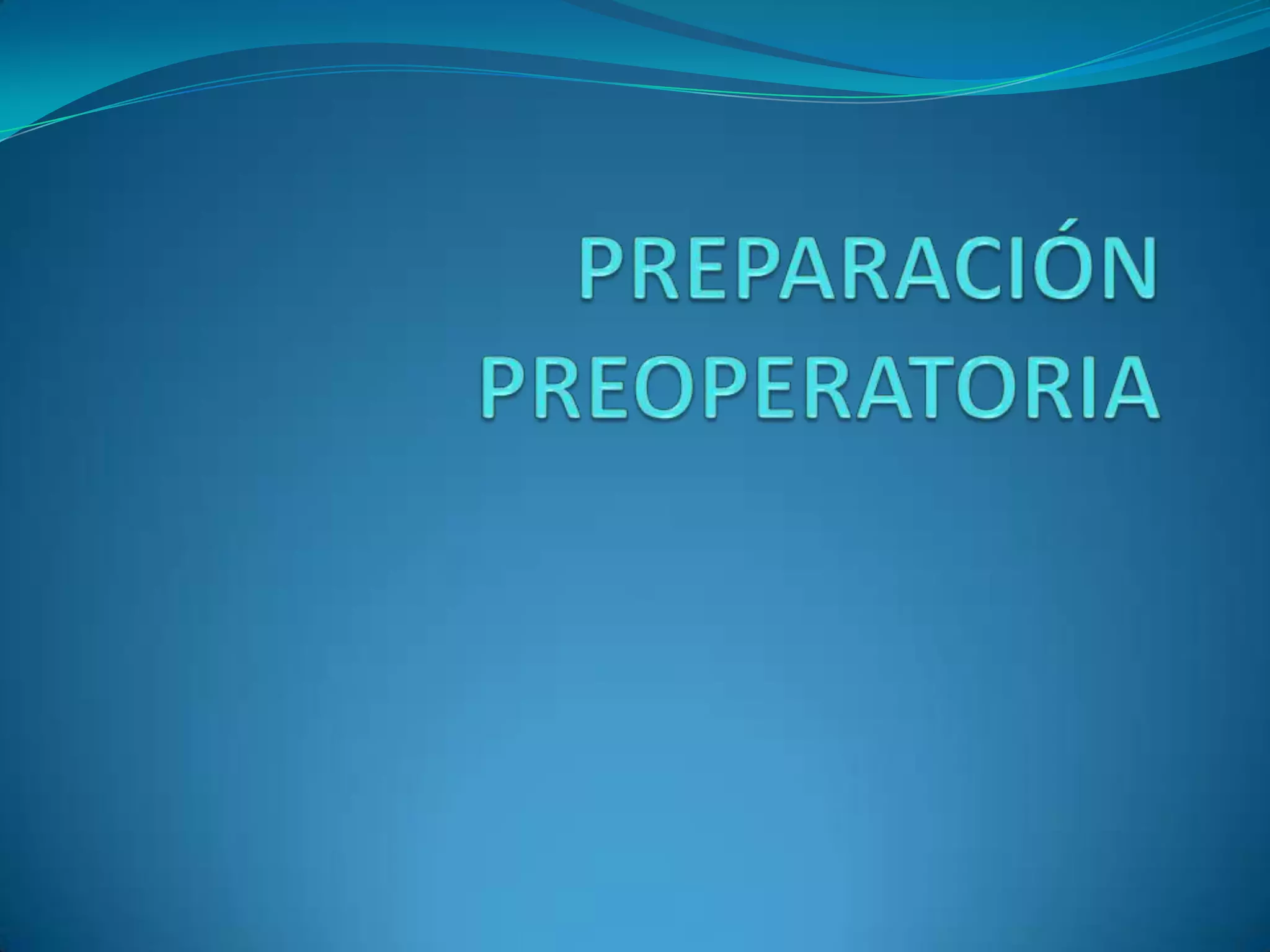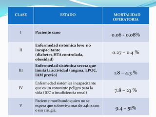 El documento habla sobre la preparación preoperatoria del paciente. Incluye una evaluación preoperatoria por sistemas como el cardiovascular, pulmonar, renal y otros para identificar factores de riesgo. También cubre consideraciones adicionales como la edad, estado nutricional y obesidad del paciente. Por último, revisa listas de comprobación preoperatorias que incluyen la profilaxis antibiótica y revisión de la medicación del paciente.